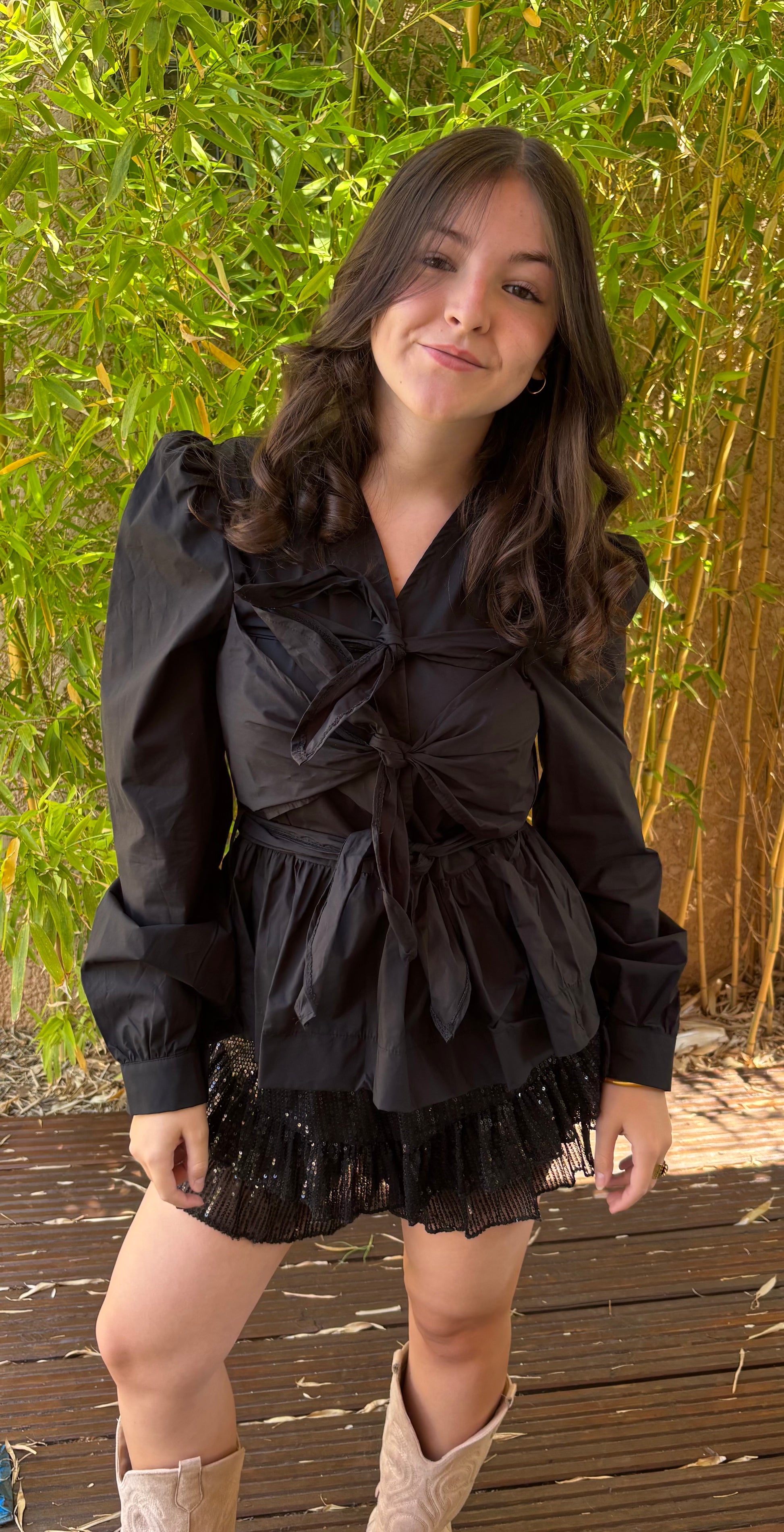 Élégante et pleine de charme, cette blouse noire à nœuds est un indispensable du dressing féminin. Ses détails noués ajoutent une touche de sophistication tout en jouant sur la féminité. Confectionnée dans un tissu fluide, elle se porte facilement en journée comme en soirée, avec un pantalon ajusté ou une jupe.