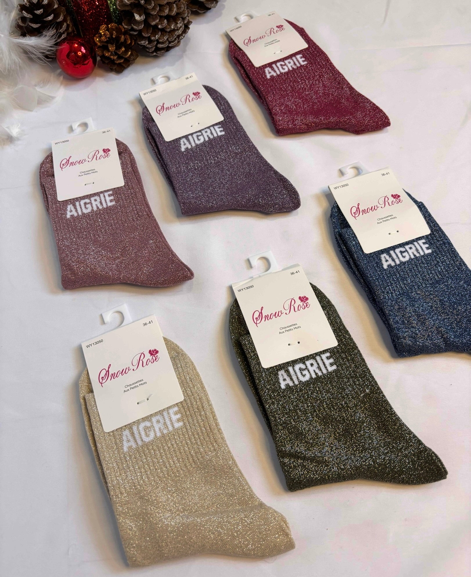 •Chaussettes à paillettes à inscription « Aigrie ».