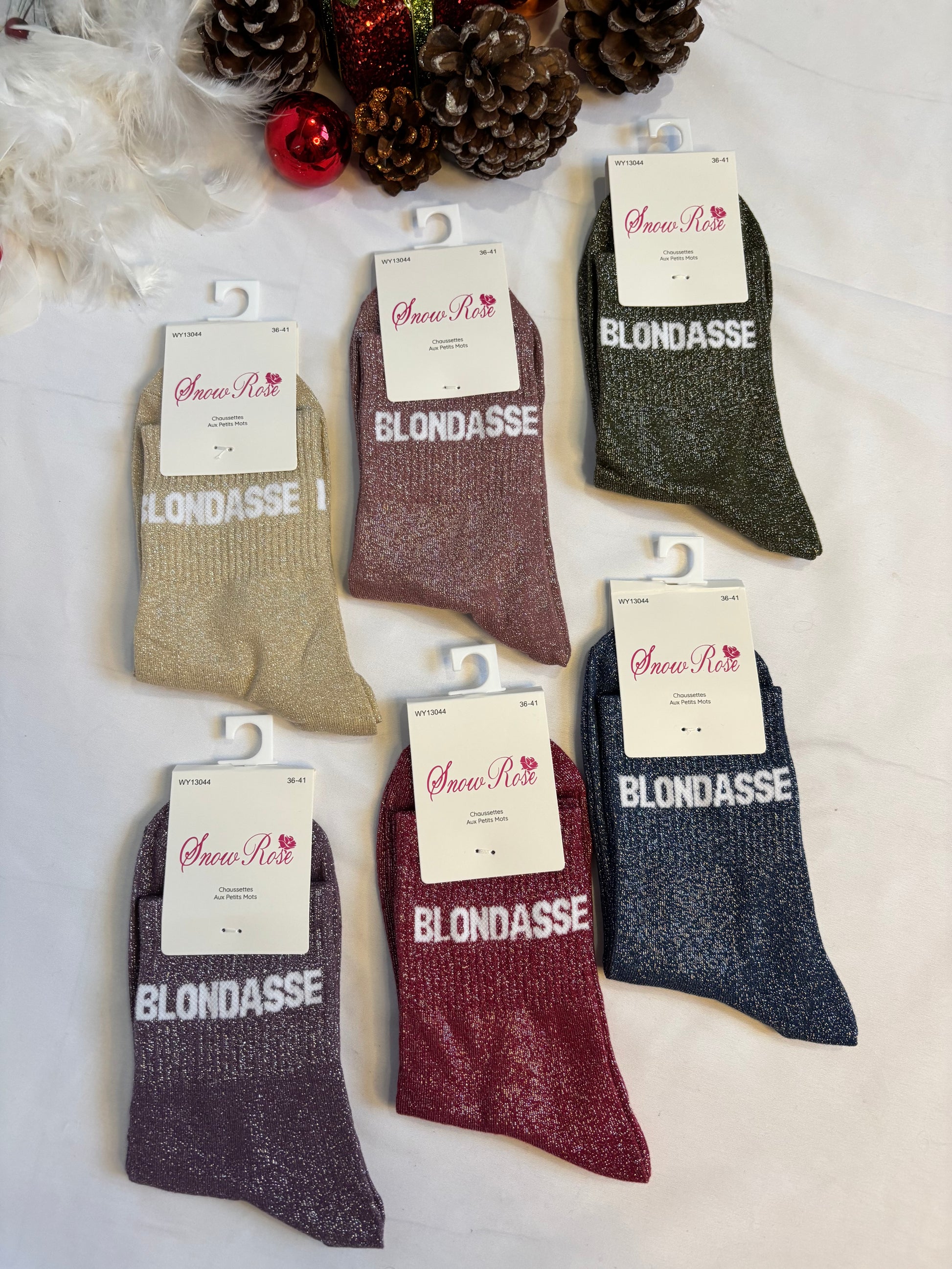 •Chaussettes à paillettes à inscription « Blondasse ».