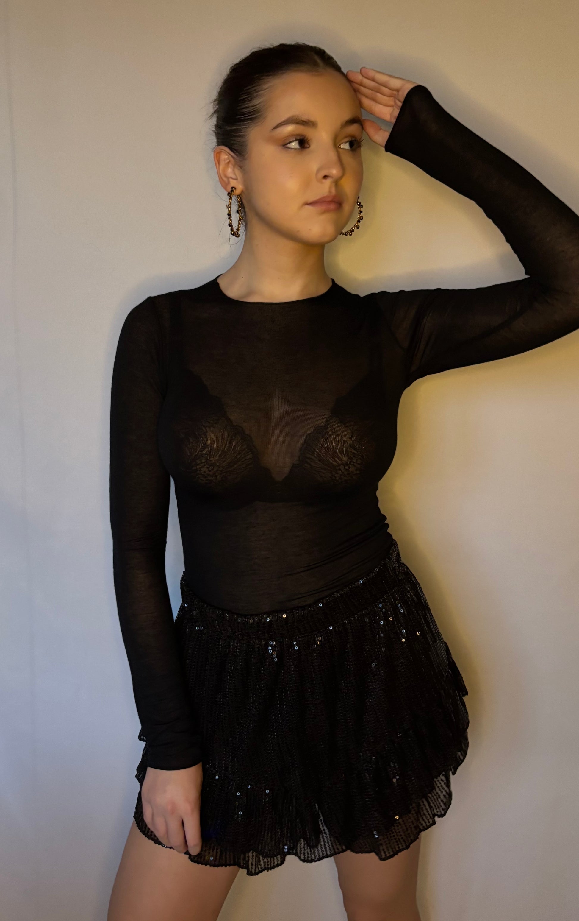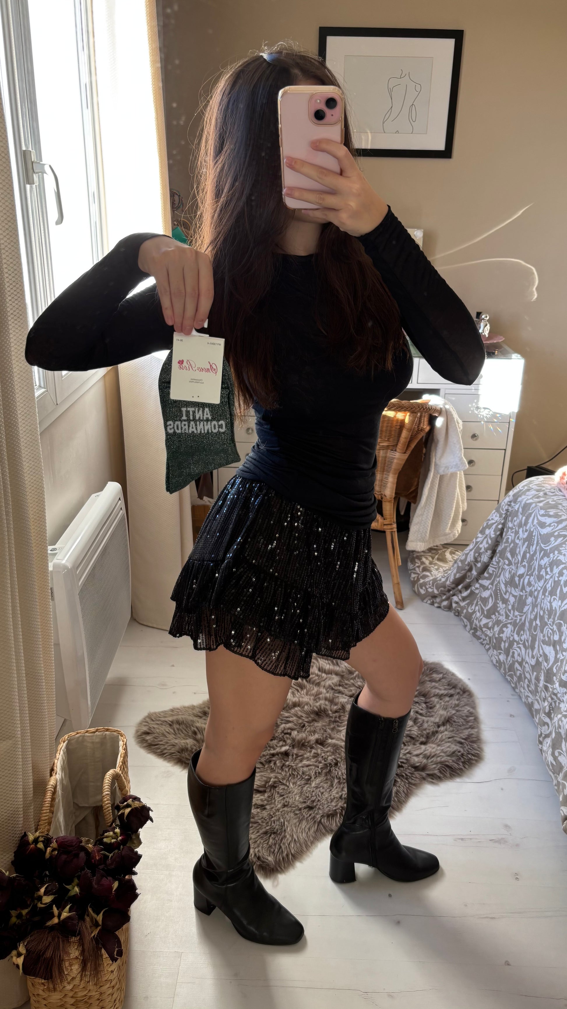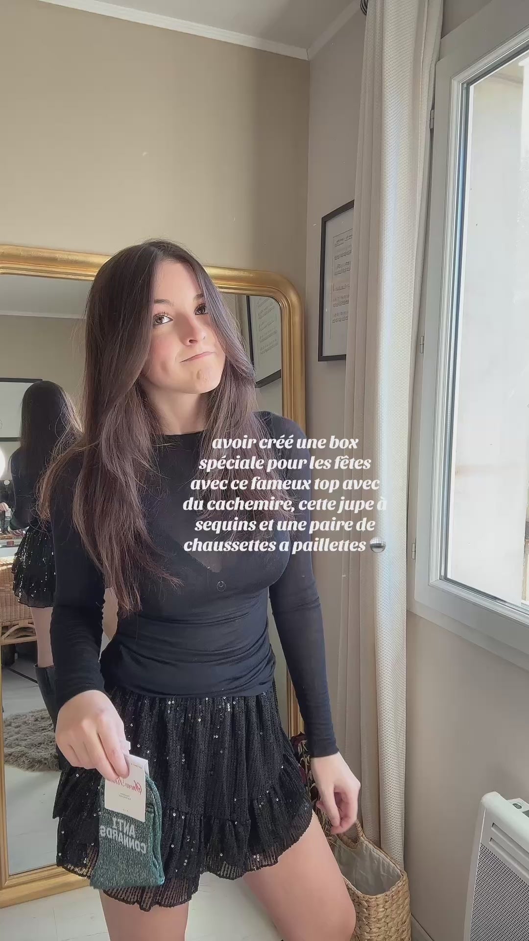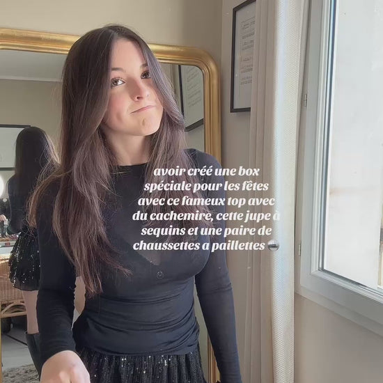 Notre box 100% Pinterest girl est composée de la fameuse jupe/short à sequins, du fameux dupe du top intimissimi effet transparent en modal et cachemire, et d’une paires de chaussettes à paillettes avec inscriptions que tout le monde s’arrache.Â